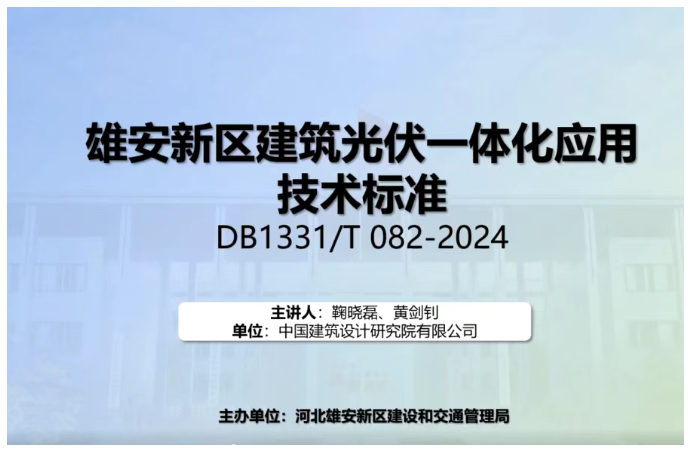 宣贯会议由新区建设和交通管理局一级业务主办李劲遐主持,会议邀请了国家住宅与居住环境工程技术研究中心副主任鞠晓磊,中国建筑设计研究院有限公司研究员黄剑钊,北京北建大建筑设计研究院有限公司常务副院长、总建筑师吕强,分别围绕《建筑用太阳能构件一体化设计与安装》《雄安新区建筑光伏一体化应用技术标准》《雄安新区建筑光伏及光伏构件设计标准》三项标准,从设计规范、技术参数、安装工艺等关键维度进行系统阐释,为新区项目实施提供明确技术指引。